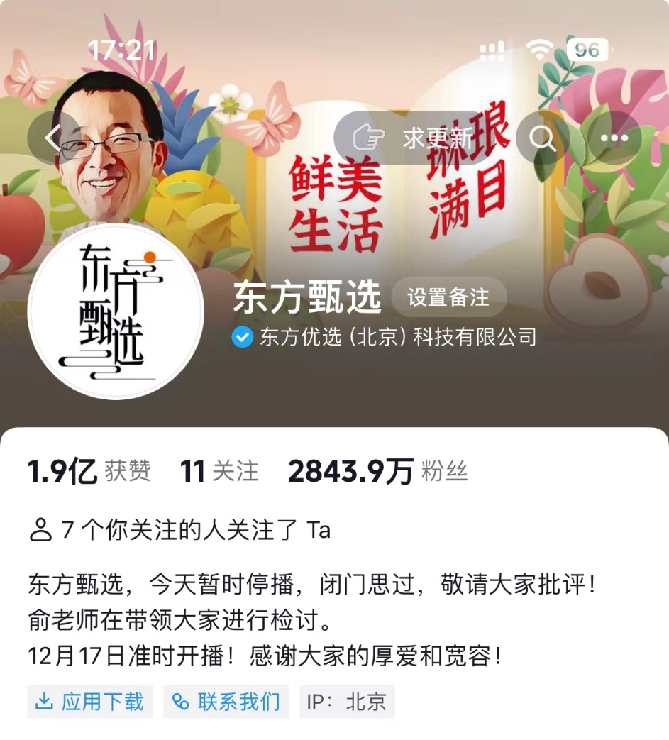 12月16日凌晨,东方甄选官方抖音账号更新了账号简介,称今天暂时停播,闭门思过。