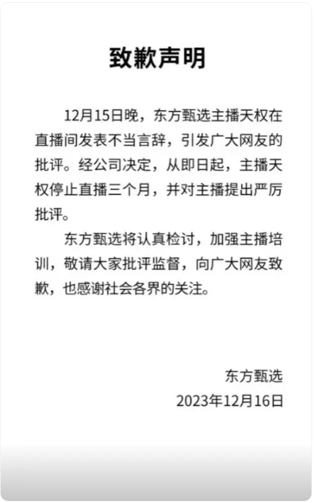 2023年12月16日,东方甄选发布致歉声明,称主播天权因言辞不当,被停播三个月。