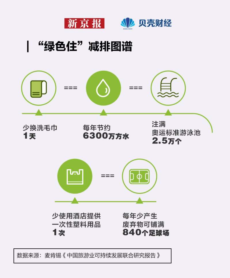 麦肯锡《中国旅游业可持续发展联合研究报告》显示,如果全体旅客都少要求换洗一天毛巾,每年就能节约6300万方水左右,大约能注满2.5万个奥运标准游泳池。旅客可以拒绝使用酒店提供的一次性塑料用品,如牙刷、盥洗用品、洗发水、梳子和瓶装水等。如果每位旅客都减少使用一次性用品,每年少产生的废弃物大约能铺满840个足球场。
