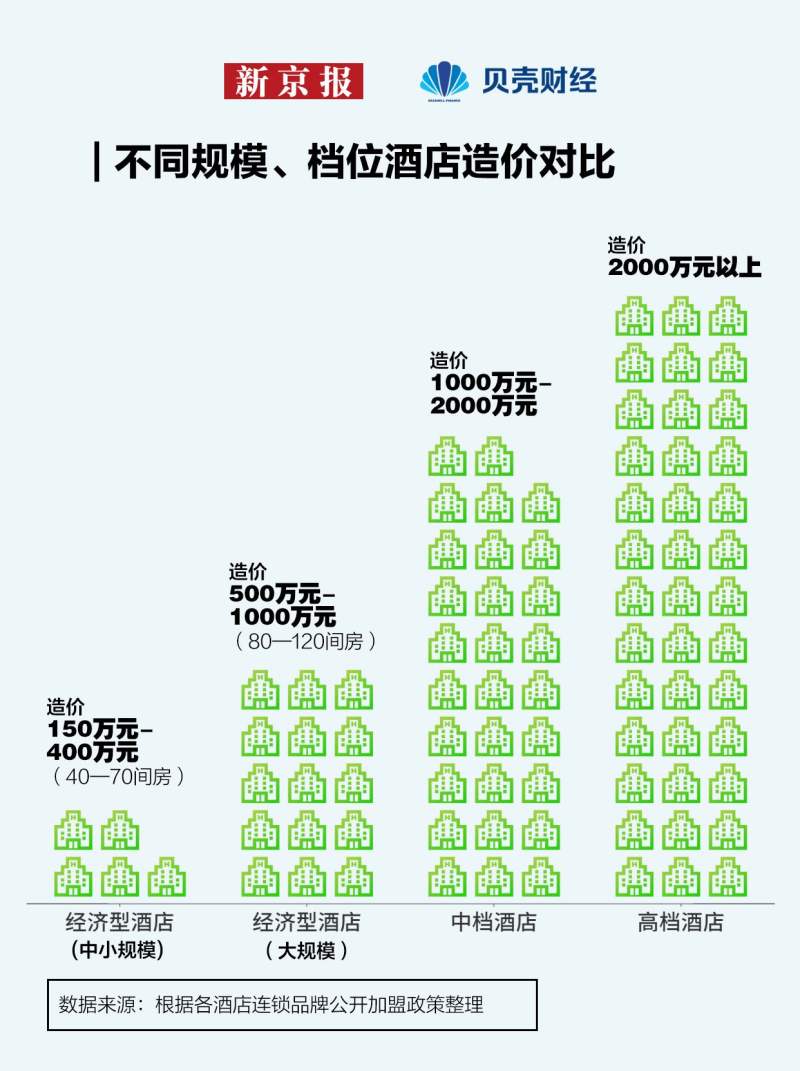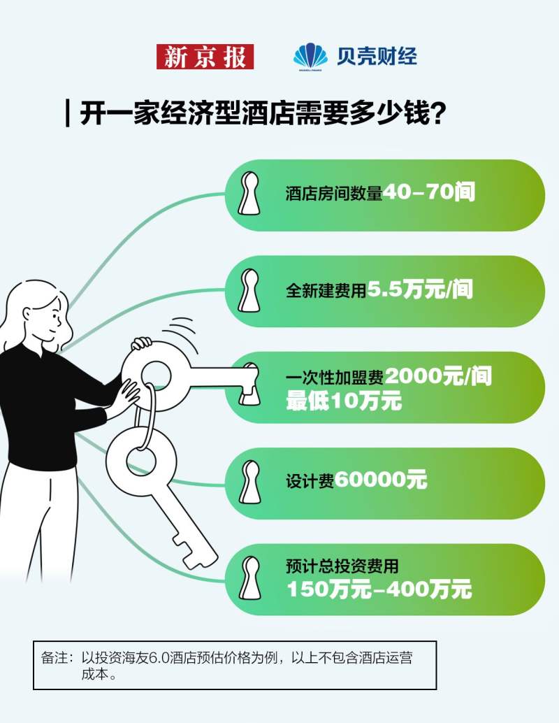 开一家经济型酒店需要多少钱?以海友酒店为例,对于最低房量的新海友酒店,全新建费用预计为5.5万元/间,一次性加盟费10万元。此外,还需要支付3万元的保证金,2万元的工程筹备费,以及6万元的设计费,预计总投资费用为250万元-400万元。如果按现有存量酒店改造,每间房的改造均价约为3.5万元,按照最低房量计算总投资额约150万元起。