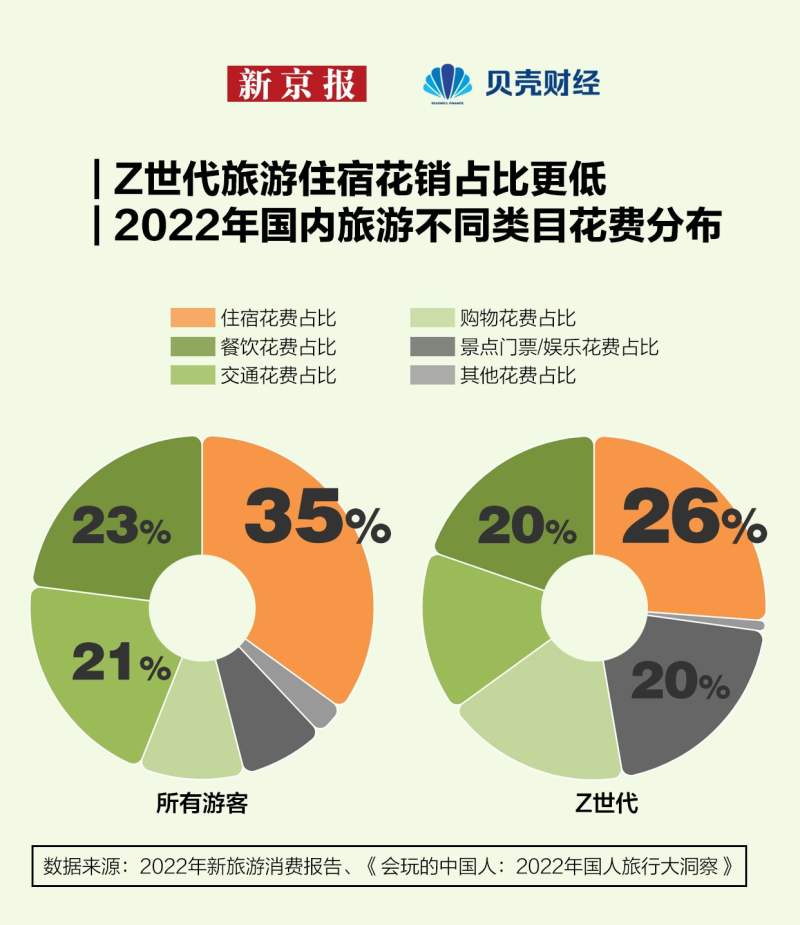 旅行对于每个人来说都是一次探索,会在游客心中留下独一无二的记忆和感受。如何分配旅行经费的差异,会创造不同的旅游体验。据穷游网发布的《会玩的中国人:2022年国人旅行大洞察》,一场旅行中住宿开支占比最大,整体游客平均住宿开支占整体的35%。而年轻游客更愿意把钱花在门票、娱乐项目以及购物消费上,而在住宿的开支占比低于平均水平,《2022年新旅游消费报告》显示,Z世代住宿开支占旅游总开支的26.2%。