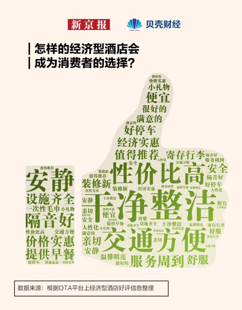 怎样的经济型酒店会成为消费者的选择?新京报贝壳财经记者整理OTA平台上经济型酒店好评信息,发现消费者的首要需求是一个干净且整洁的房间,其次是交通便利。