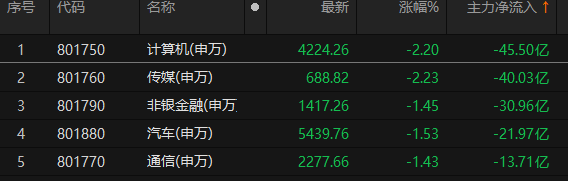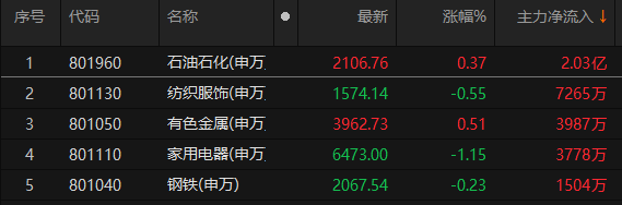 据Choice金融终端数据,截至12月20日14时08分,申万一级行业板块中,主力资金净流入石油石化、纺织服饰、有色金属等板块,其中,石油石化板块净流入超2亿元居首,达到2.03亿元;主力资金净流出计算机、传媒、非银金融等板块,其中,计算机板块净流出超45亿元居首,达到45.5亿元。