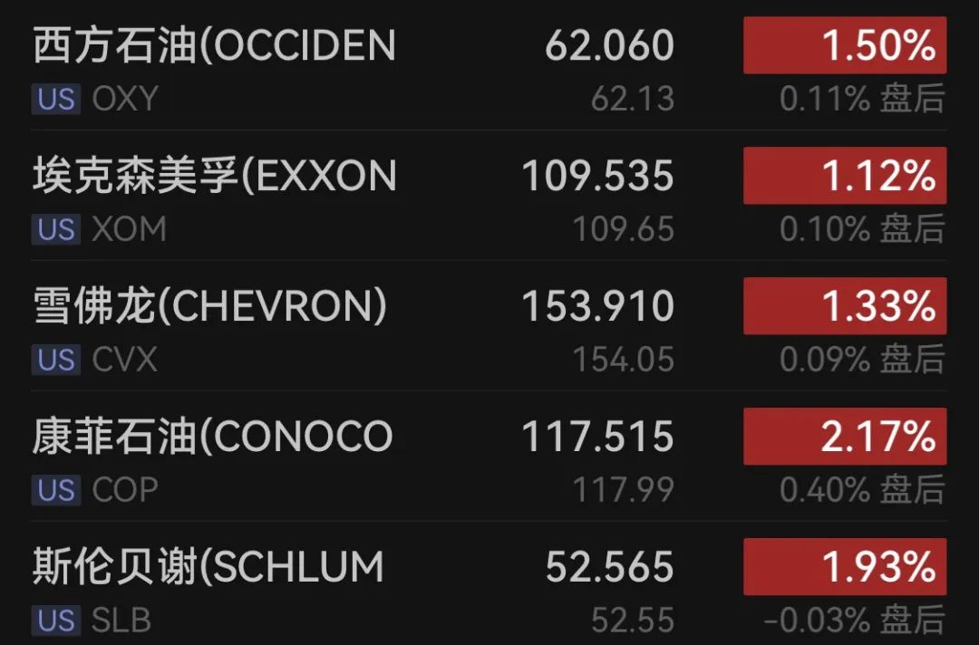 能源股全线上涨,埃克森美孚涨1.12%,雪佛龙涨1.33%,康菲石油涨2.17%,斯伦贝谢涨1.93%,西方石油涨1.5%。