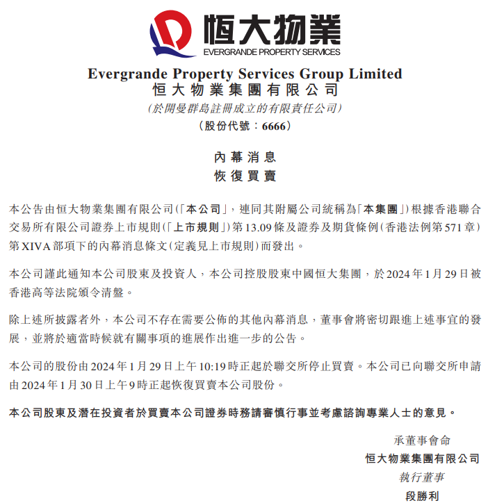 1月29日,恒大物业在港交所公告,已向联交所申请由2024年1月30日上午9时正起恢复买卖本公司股份。
