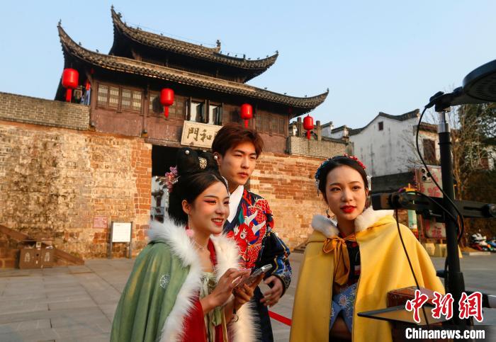 1月10日,演员在安徽省黄山市歙县徽州古城通过直播方式推广剧目。施亚磊摄